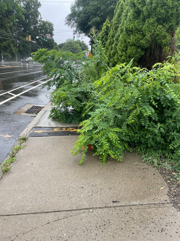 Of course, I am talking about objects that have invaded my space on the sidewalks. They run the gamut from cars, garbage, trees and bushes.