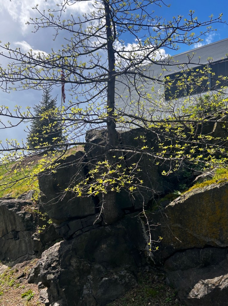 As you can see it struggles. Every spring I wonder if it has survived the winter. It did, the leaves are budding out. It is amazing that it can survive in this location.