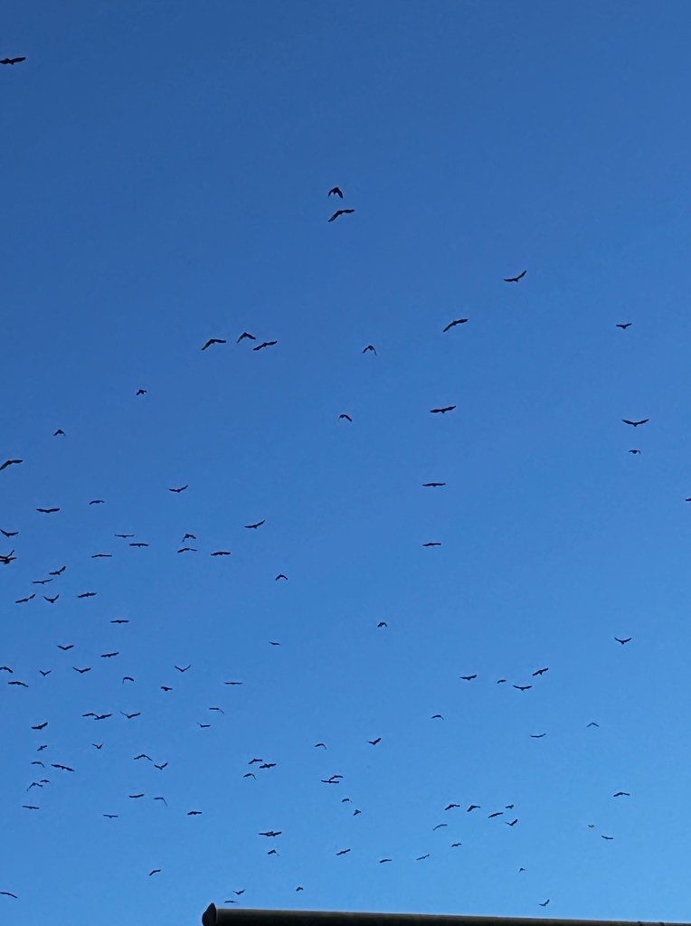 It is crows gathering for their night’s sleep. Reading up on crows, they gather at dusk to roost for the night. They were heading for downtown Stamford. The article mentioned that they roost together for safety in number and to keep warm.